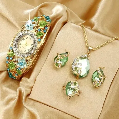Vintage 4PCS Watch Gift Set Fashion Flower Green Diamond Women Watch Quartz Ladies Watch